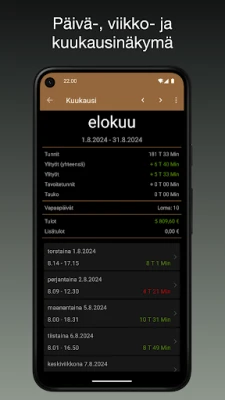 Työajan hallinta on nyt vaivatonta ja tarkkaa iboChron-sovelluksen avulla. Olitpa sitten yrittäjä, freelancer tai työntekijä, tämä monipuolinen työkalu tarjoaa kattavan ratkaisun tuntien, ylitöiden ja ansioiden seuraamiseen. Kirjaa työaikasi kätevästi liukukytkimellä tai lisää myöhemmin tauot huomioiden. iboChron pitää sinut ajan tasalla päivittäisistä, viikoittaisista ja kuukausittaisista työajoista, sairauspoissaoloista sekä lomista, varmistaen, että sinulla on aina selkeä yleiskuva tilanteestasi.