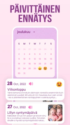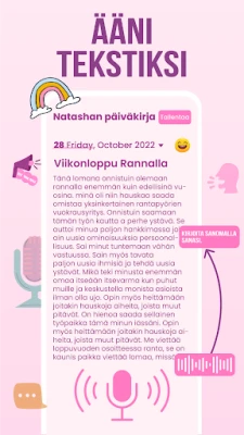 **Päiväkirjani** tarjoaa monipuoliset tavat ikuistaa kokemuksesi. Voit kirjoittaa perinteisesti, tallentaa ääneen puhelimitse mielessäsi pyörivät asiat tai liittää kuvia, jotka herättävät muistot uudelleen eloon. Erityisen kätevää on sisäänrakennettu puheesta tekstiksi -toiminto, jonka avulla voit muuntaa ajatuksesi kirjoitetuksi sisällöksi vaivattomasti – täydellistä hetkiin, jolloin inspiraatio iskee, mutta sormet tuntuvat liian hitailta. Rikasta merkintöjäsi omilla piirroksillasi ja luo uniikkeja visuaalisia muistoja.