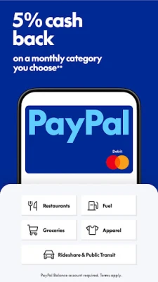 Laajenna taloudellisia mahdollisuuksiasi PayPalin edistyksellisten ominaisuuksien avulla. Hanki PayPal Debit Mastercard suoraan sovelluksesta ilman luottotarkastusta ja shoppaile kaikkialla, missä Mastercard hyväksytään. Ansaitse jopa 5 % rahanpalautusta valitsemastasi kategoriasta joka kuukausi, muuttaen ostoksesi palkinnoiksi. Lisäksi voit syventyä digitaaliseen valuuttaan ostamalla, myymällä ja hallitsemalla Bitcoinia, Ethereumia, PayPal USD:tä ja muita kryptovaluuttoja turvallisesti. Kehitä säästöjäsi kilpailukykyisellä tuotolla PayPal Savings -tilillä, asettaen tavoitteita ja seuraten edistymistäsi helposti.