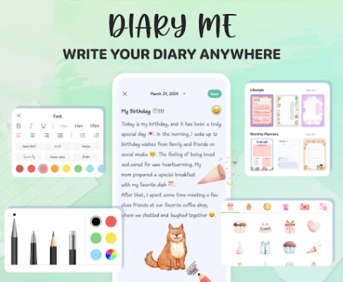 Diary Me: My Journal With Lock on turvallinen ja luova päiväkirjasovellus. Tallenna ajatuksesi, ideasi ja muistosi suojattuun tilaan monipuolisilla ominaisuuksilla. Suojaa merkintäsi salasanalla tai biometrisillä lukoilla, hyödynnä puheentunnistusta ja rikastuta tekstejäsi kuvilla sekä piirroksilla.