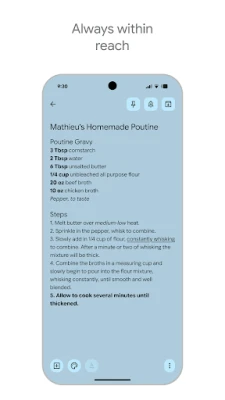 Hetken inspiraatio voi syttyä milloin tahansa – junassa, kävelyllä tai kesken mielenkiintoisen keskustelun. Google Keep on suunniteltu varmistamaan, että yksikään loistoidea ei pääse haihtumaan. Olipa kyseessä sitten lyhyt muistutus, perusteellinen tehtävälista tai inspiroiva kuva, voit tallentaa sen vaivattomasti. Kiireessä? Saneluominaisuus muuntaa puheesi tekstiksi sekunneissa, säästäen aikaasi ja varmistaen, että ajatuksesi ovat järjestettävissä myöhemmin. Voit hyödyntää puhelimesi tai tablettisi widgetejä lisätäksesi muistiinpanoja nopeasti suoraan aloitusnäytöltä, ja Wear OS -kelloosi saat kätevät pikakuvakkeet tärkeimmille asioille.