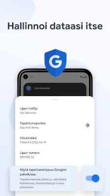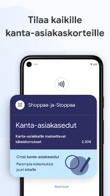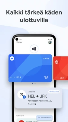 Google Wallet ei ole pelkkä digitaalinen säilytyspaikka; se on älykäs kumppani arkeen. Se ehdottaa hyödyllisiä asioita juuri oikeaan aikaan, esimerkiksi ilmoittamalla tarkistuskortistasi matkustuspäivänä, jotta tärkeät asiat eivät jää huomaamatta. Saat yksityiskohtaiset tiedot maksutapahtumistasi, mukaan lukien Google Mapsin paikkatiedot, pitäen kuitit järjestyksessä. Lisäksi Google Wallet integroituu saumattomasti Kalenterin ja Assistantin kanssa, pitäen sinut ajan tasalla lento- ja tapahtumamuutoksista sekä porttien vaihdoksista. Shoppaile fiksummin ja seuraa kanta-asiakaspistesaldojasi suoraan Googlen palveluissa, kuten Mapsissa ja Shoppingissa. Käyttöönotto on vaivatonta, sillä voit siirtää Gmailiin tallennetut kortit, matkakortit ja kanta-asiakaskortit suoraan Google Walletiin.