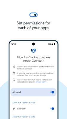 Yksityisyytesi ja tietoturvasi ovat Health Connectin ensisijaisia prioriteetteja. Sinulla on täysi hallinta siitä, mitä tietoja jaat ja kenen kanssa. Ennen kuin uusi sovellus saa pääsyn dataasi, voit tarkastella ja valita tarkasti jaettavat tiedot. Voit myös vaivattomasti muuttaa näitä asetuksia tai tarkistaa, mitkä sovellukset ovat viimeksi käyttäneet tietojasi, varmistaen mielenrauhan ja absoluuttisen hallinnan omaan henkilökohtaiseen terveysdataasi.