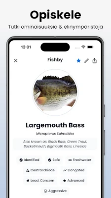 Muuta älypuhelimesi tehokkaaksi kalojen tunnistusvälineeksi Kalalaji - Fishby -sovelluksella. Tunnista kalalajit välittömästi kuvasta, kuten lohet ja taimenet, hyödyntäen laajaa tietokantaa. Helppo ja hauska kalojen tunnistus, myös offline-tilassa.