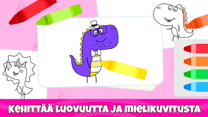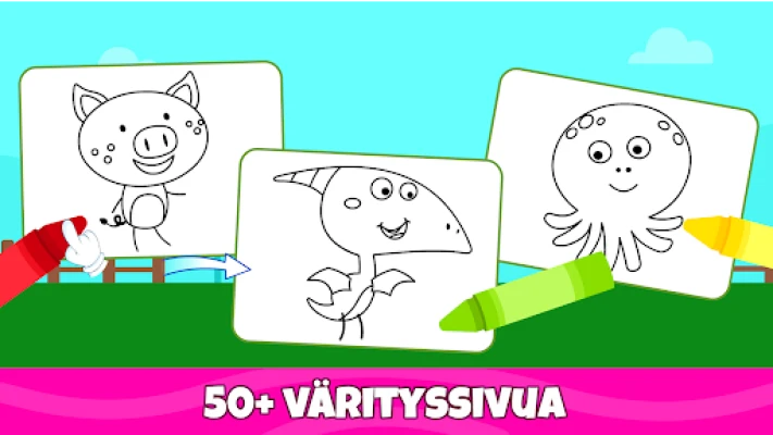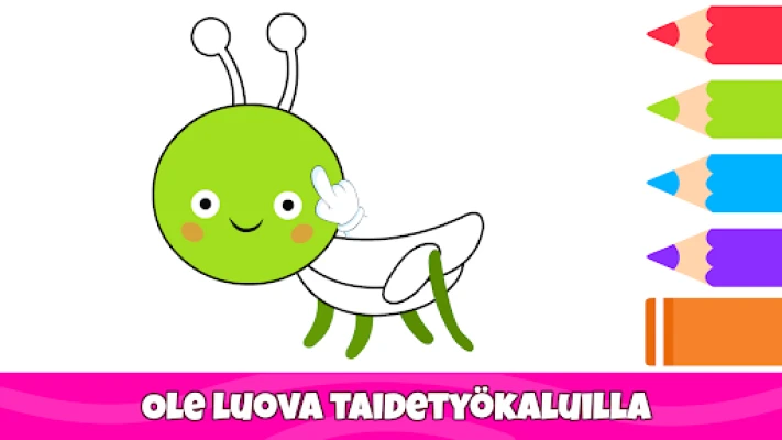 Tarjoa lapsellesi sotkuton ja vaivaton tapa ilmaista itseään. Tässä värityssovelluksessa lapset ja pikkulapset pääsevät tutkimaan taiteellista puoltaan yksinkertaisella ja intuitiivisella käyttöliittymällä. Se pitää pienet kädet ja mielet kiireisinä pitkiä aikoja, kannustaen samalla itsenäiseen leikkiin ja keskittymiskyvyn kehittymiseen. Ideaalinen tapa esitellä 1–5-vuotiaat lapset maalaamisen ja värittämisen ihanaan maailmaan.