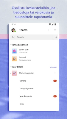 Microsoft Teams on monipuolinen sovellus, joka yhdistää yhteisöt ja tiimit tehokkaaseen yhteistyöhön. Hallitse viestintää, tiedostoja, tehtäviä, kokouksia ja kalentereita turvallisesti yhdessä paikassa. Kokoa ihmiset yhteen ideointiin, suunnitteluun ja asioiden aikaansaamiseen.