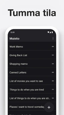 Tämä ainutlaatuinen muistiinpanosovellus on suunniteltu moderniksi korvaajaksi perinteisille muistikirjoille ja tarkistuslistoille, karsien pois kaiken turhan. Sen selkeän käyttöliittymän ansiosta voit luoda nopeita muistioita ja tehtävälistoja yhdellä napautuksella, ilman huolta tallennuksesta – kaikki kirjoittamasi tallentuu automaattisesti. Järjestä ajatuksesi selkeiksi kokonaisuuksiksi ja hyödynnä visuaalista järjestelyä: voit värittää muistiinpanosi kuudella eri sävyllä, mikä tekee tärkeimpien tietojen löytämisestä hetkessä. Tumma tila puolestaan takaa mukavan käyttökokemuksen kaikissa valaistusolosuhteissa.